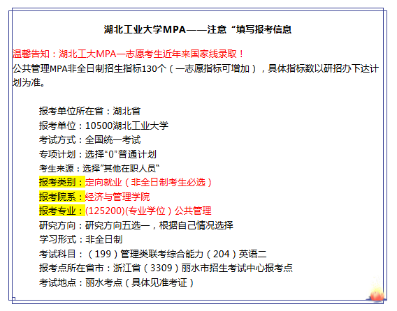 我校2026年MPA招生指標(biāo)非全日制計(jì)劃130個(gè)。具體招生指標(biāo)與當(dāng)年研招辦下達(dá)計(jì)劃數(shù)為準(zhǔn),根據(jù)考生的入學(xué)考試成績(jī)和復(fù)試成績(jī)由我校自主劃定分?jǐn)?shù)線擇優(yōu)錄取。1、非全日制(定向)公共管理碩士(MPA)研究生,人事檔案及工資關(guān)系不轉(zhuǎn)入學(xué)校,培養(yǎng)采取非脫產(chǎn)學(xué)習(xí)方式。2、授課方式:授課方式強(qiáng)調(diào)課堂講授、案例分析、小組討論、學(xué)生自學(xué)、社會(huì)調(diào)研、專題講座相結(jié)合。 非全日制學(xué)制3年,采取周末授課形式。學(xué)生學(xué)習(xí)期滿、修滿培養(yǎng)方案規(guī)定學(xué)分、成績(jī)合格,并完成學(xué)位論文等規(guī)定培養(yǎng)環(huán)節(jié)者,授予湖北工業(yè)大學(xué)非全日制公共管理碩士(MPA)學(xué)位和研究生畢業(yè)證書。 非全日制全程培養(yǎng)費(fèi):待定(含論文指導(dǎo)費(fèi)、答辯費(fèi)),不含教材費(fèi)。如學(xué)校學(xué)費(fèi)有變動(dòng),最后以物價(jià)局核定收費(fèi)標(biāo)準(zhǔn)收取。 重要提示:學(xué)籍注冊(cè)后,學(xué)生因個(gè)人原因不能堅(jiān)持學(xué)習(xí)的,視為自動(dòng)退學(xué),費(fèi)用不退! 為了提高2026年報(bào)考學(xué)生錄取率,麗水開大教學(xué)點(diǎn)十幾年來一直全程特聘浙大、浙師大、南京等知名高校MBA、MPA名師舉辦考前輔導(dǎo)班,歷年上線率高;報(bào)全程輔導(dǎo)班《免費(fèi)贈(zèng)送全程網(wǎng)課+輔導(dǎo)資料》,歡迎大家報(bào)班! 公共管理MPA、工商管理MBA、高級(jí)工商管理EMBA、工程管理MEM、旅游管理MTA、會(huì)計(jì)碩士MPACC、審計(jì)碩士MAUD、圖書情報(bào)MLIS均可參加管理類統(tǒng)考筆試輔導(dǎo)加油站!基礎(chǔ)班+系統(tǒng)強(qiáng)化班+沖刺串講??及?/strong>
